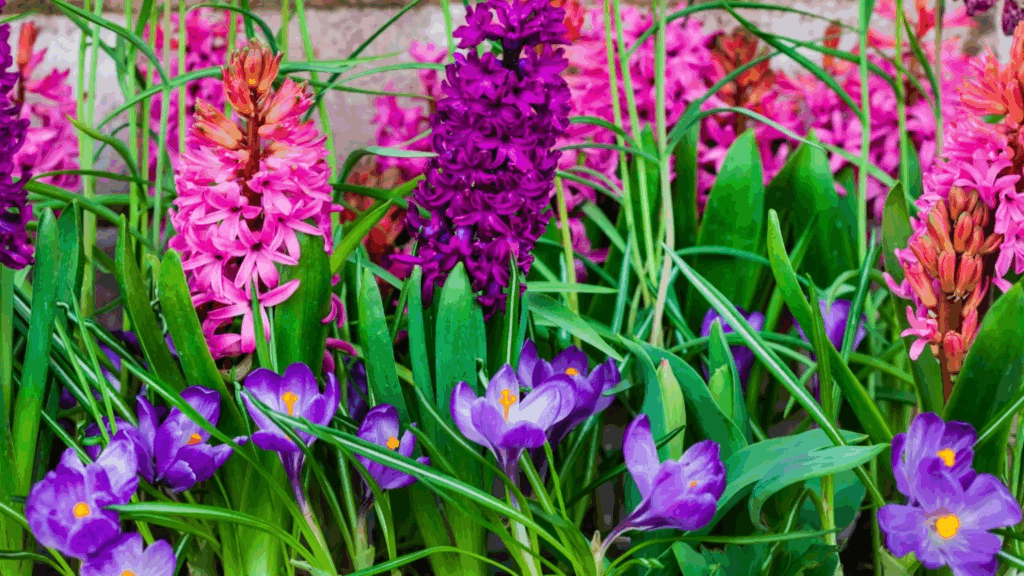 Os crocus, por serem pequenos e demandarem plantio raso, se harmonizam perfeitamente com os bulbos mais profundos dos jacintos, permitindo o plantio em camadas no mesmo recipiente e prolongando o período de floração.
