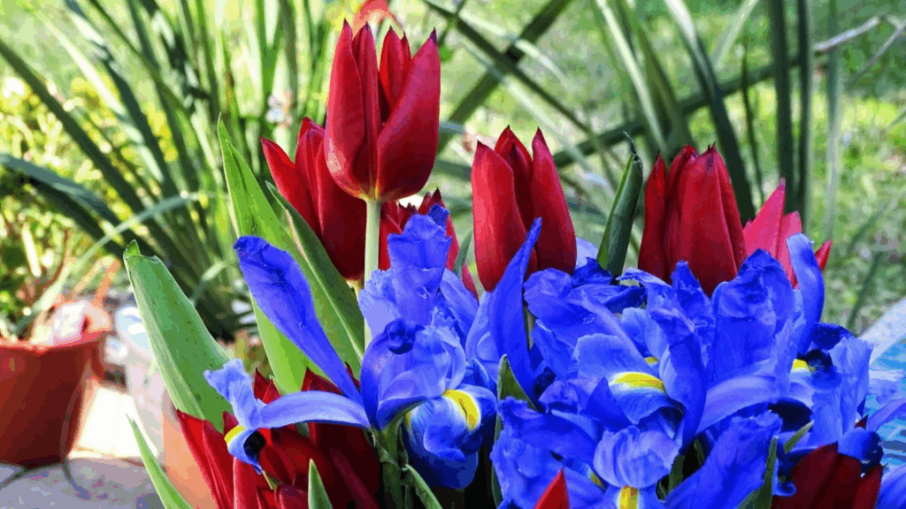 Se as tulipas e os narcisos são considerados os clássicos bulbos de primavera, as tulipas combinadas com íris representam uma versão mais refinada e sofisticada. A união dessas flores exala uma elegância especial, que poucas outras combinações conseguem transmitir.