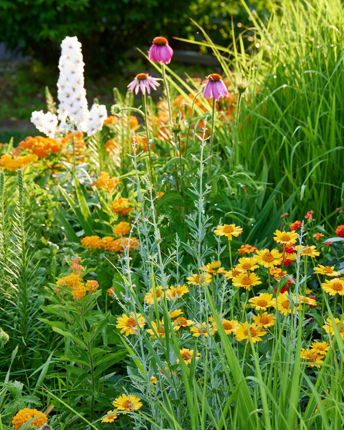 O jardim de Jack transita para o verão com tons quentes. Outras flores marcantes surgem dos falsos girassóis “Tuscan Sun” (Heliopsis helianthoides “Tuscan Sun”, Zonas 3–9).