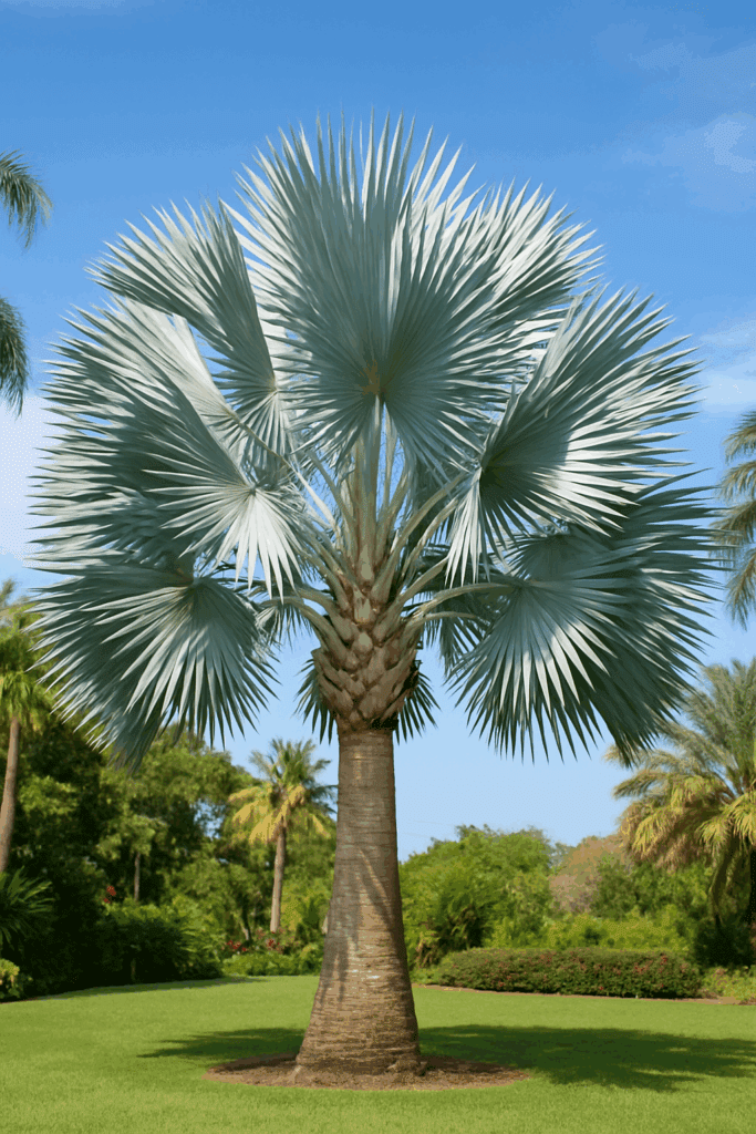 Originária de Madagascar, a Palmeira Azul destaca-se pelas folhas prateadas e formato esférico, alcançando até 25 metros de altura.